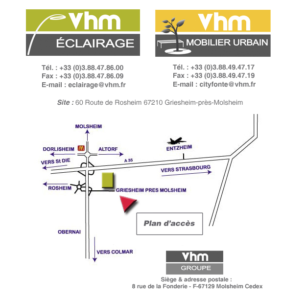 Vhm Mobilier urbain est situéà 25 km au sud de l'aéroport de STRASBOURG-ENTZHEIM, accès direct par autoroute A352, à 35 km de COLMAR par l'autoroute A35, et à 30 km de SAVERNE par la RN4 puis la D422.